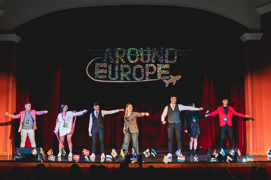 Atmosfera a fost setată la cote maxime încă din primele secunde: luminile s-au stins, s-au auzit sunetele obișnuite ale unui aeroport, iar o voce din culise ne-a invitat să ne pregătim de zbor: „Doamnelor și domnilor, vǎ vorbeşte Cǎpitanul.”, s-a auzit în toată sala. „Vǎ rugăm să vă ocupați locurile și să vă fixați centurile de siguranță. Echipajul Around Europe, Balul Bobocilor vă urează bun venit la bord. Ne pregătim pentru Zborul Special 2025, cu escală prin toate colțurile Europei. Pregătiți-vă pentru decolare… Iar dacă sunteți gata de călătorie, susțineți-ne cu un rând de aplauze furtunoase!”. Iar publicul a răspuns pe măsură, cu aplauze și râsete care au umplut sala.