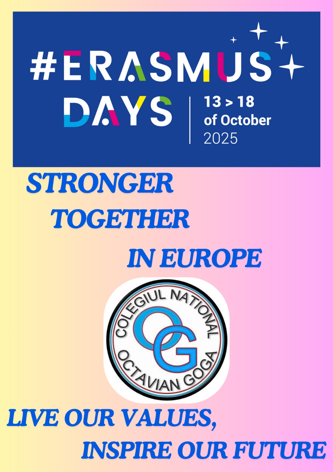 Cu această ocazie, Colegiul Național “Octavian Goga” organizează evenimentul intitulat „STRONGER TOGETHER IN EUROPE”. Sub acest titlu se vor reuni o serie de activități realizate de cadrele didactice și elevii participanți la mobilitățile care au avut loc în anul școlar 2024-2025, anul al doilea din cadrul Acreditării Erasmus +, cu numărul 2022-1-RO01-KA120-SCH-000106556.