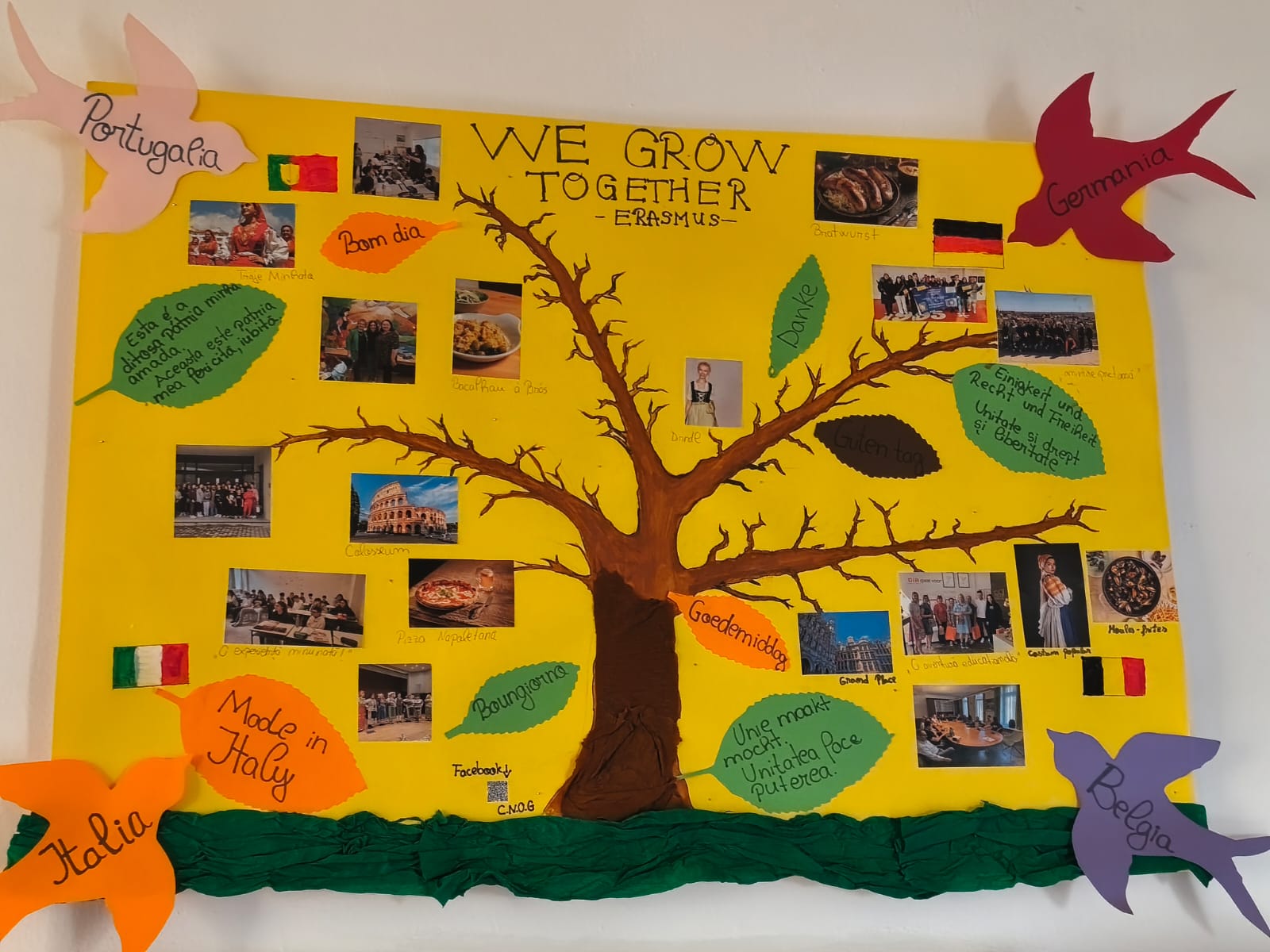 Copacul Erasmus “We Grow Together” creat de ele este un copac al amintirilor și al lecțiilor învățate în cele 4 mobilități Erasmus desfășurate în anul școlar 2024-2025. Fiecare ramură reprezintă o țară parteneră a colegiului nostru, iar fiecare frunză vorbește despre o experiență sau un moment memorabil din mobilitate. Scopul panoului este acela de a ne reaminti că suntem o Europă unită, chiar dacă suntem diferiți.