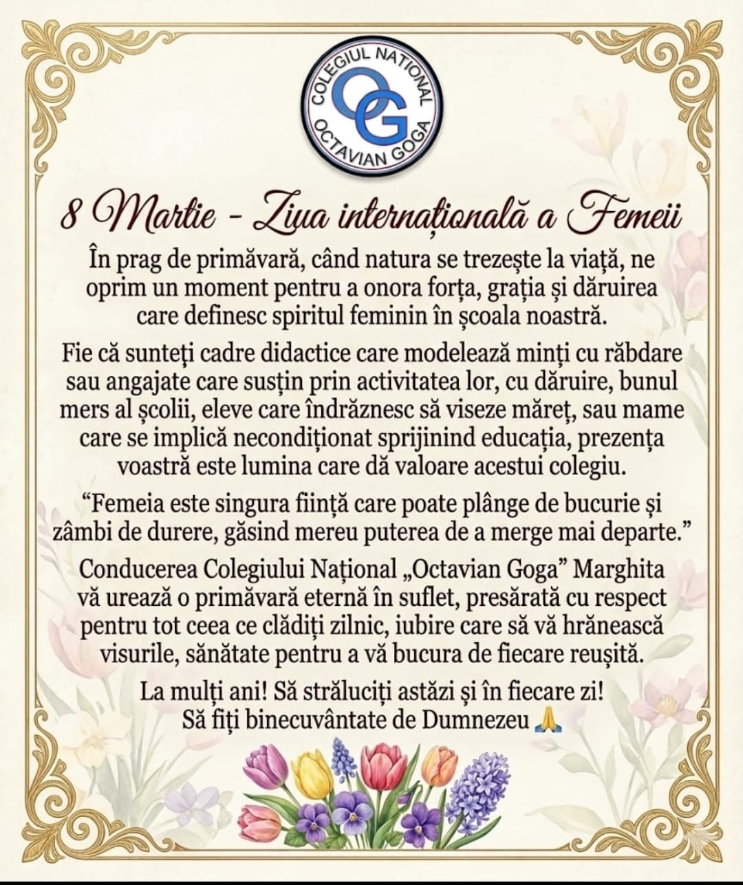 Sărbători Mesaj cu ocazia zilei de 8 Martie o zi ago costelascristian Continue Reading Previous Emoție și recunoștință de 8 Martie la Colegiul Național „Octavian Goga” Marghita