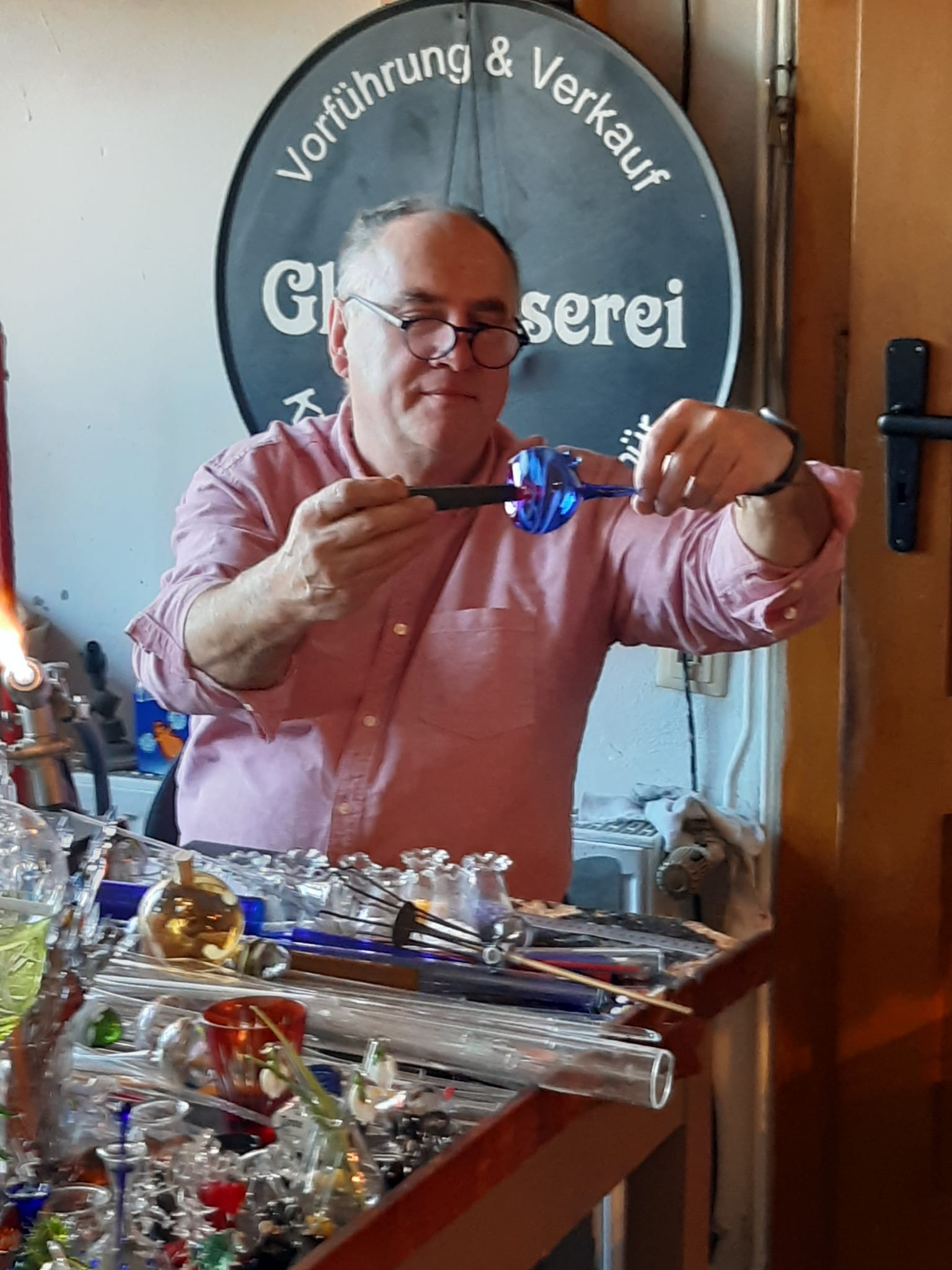 După ce am mâncat ne-am îndreptat spre atelierul de sticlărie din oraș, unde am fost întâmpinați de meșterul german Thomas și de vecinul acestuia, Schaser Gert (un inginer proiectant -pensionar- de origine română). Acesta din urmă ne-a vorbit despre realizările sale din România și Germania.